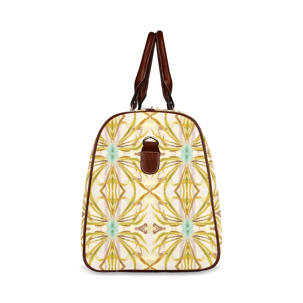Made from durable high-grade waterproof fabric, it contains one inner zipper pocket on the back wall, and has sturdy brown Vegan Leather handles as well as a comfortable shoulder strap.